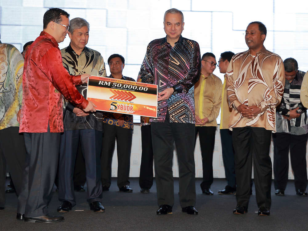 Primer Group Managing Director, Dato' Leong Kin Mun presenting a mock cheque to His Royal Highness Sultan Dr. Nazrin Muizzuddin Shah Ibni Almarhum Sultan Azlan Muhibbuddin Shah Al-Maghfullah, Sultan of Perak for the Company's CSR contribution of RM50,000 for poverty eradication.