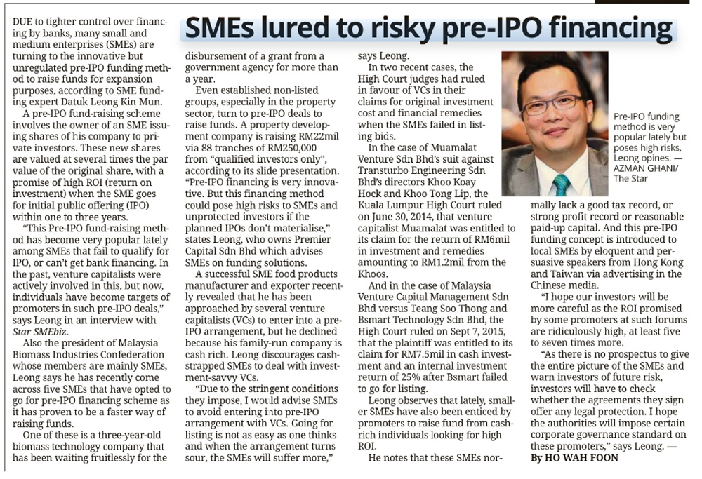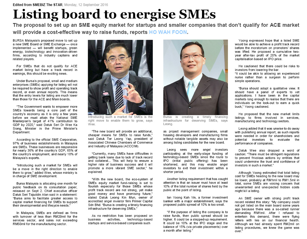 Views on the proposed Bursa's New SMEs Listing Board for fundraising in The Star, September 2016.